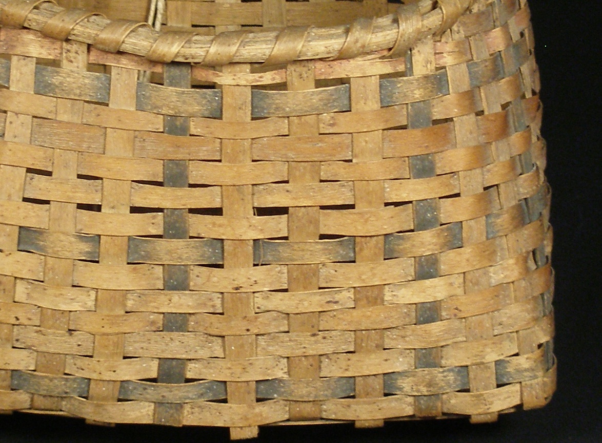 Probably used to store fruits and vegetables, this basket was made to hang on a hook on the wall (Hopkinton Historical Society). Wide-open spaces at the bottom of the basket would allow air to circulate facilitating the quick drying of food or other items placed in the basket (Hopkinton Historical Society). According to the Hopkinton Historical Society, there is a residue on the inside of the basket that may suggest something wet was hung to dry inside it (Hopkinton Historical Society). The strong handle would probably be able to support a heavy load. In addition, the edge of the basket is reinforced with a continuous splint in a spiral formation. The strength of the basket illustrates the skill with which baskets are made. Although the basket is utilitarian in nature, "red and black natural dyes were swabbed on the exterior of some of the splints and on the visible portion of the interior"(Hopkinton Historical Society). The visible black splints make a square checkerboard shape, which compliments the pattern of the plain colored splints. The black splints were dyed with natural dyes, which suggest the date of the basket to be from the late 1700s to mid 1800s (Hopkinton Historical Society).