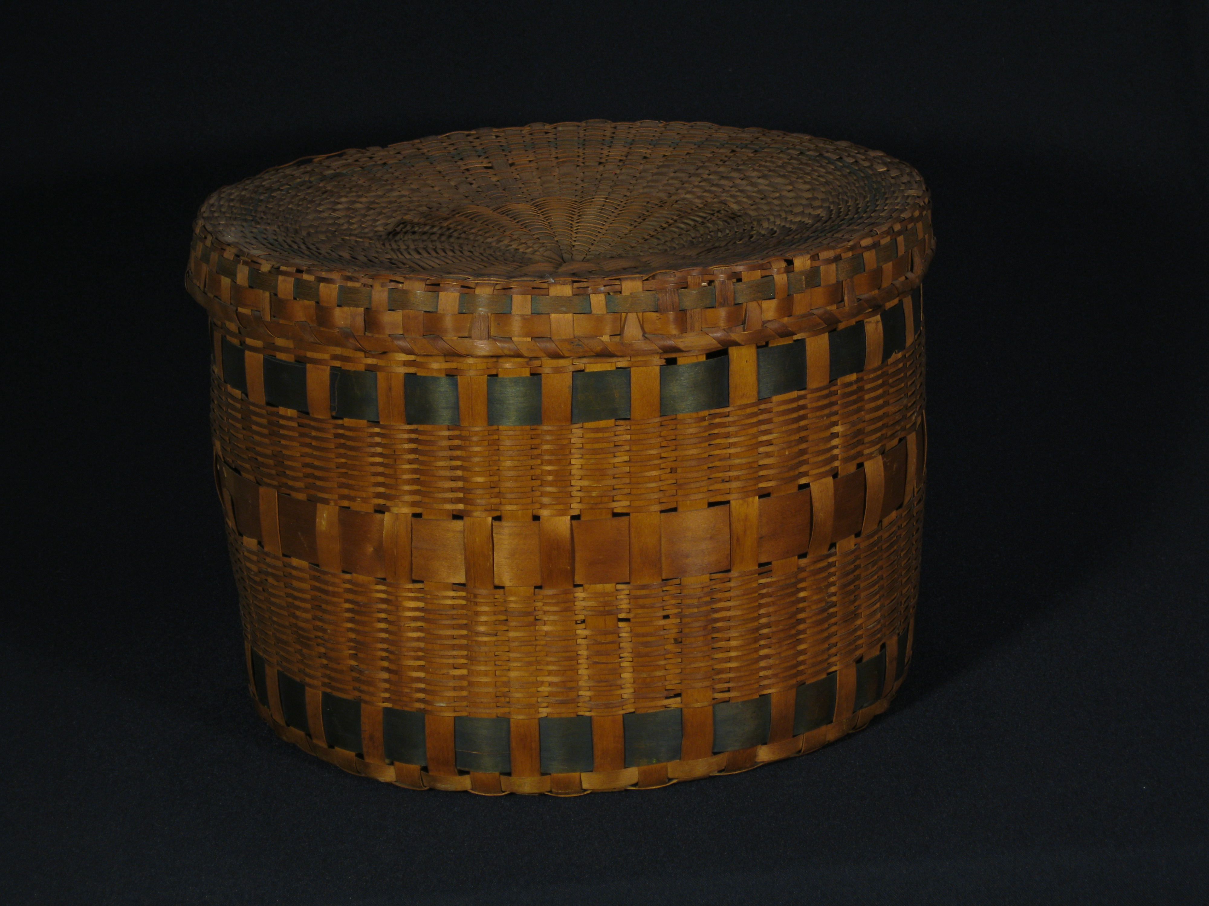 Art historian Joan Lester details these aesthetic changes: “Basket weavers were already accustomed to accommodating their craft to non-Indian tastes and styles. By the 1860s, round, covered ash-splint baskets with splints of varying widths, swabbed with color, were being made by Penobscot weavers [in Maine]. Modeled after hat boxes and bandboxes, these baskets were sought after for their practical as well as aesthetic qualities. And the weavers seem to have understood what would appeal to this new tourist market.”