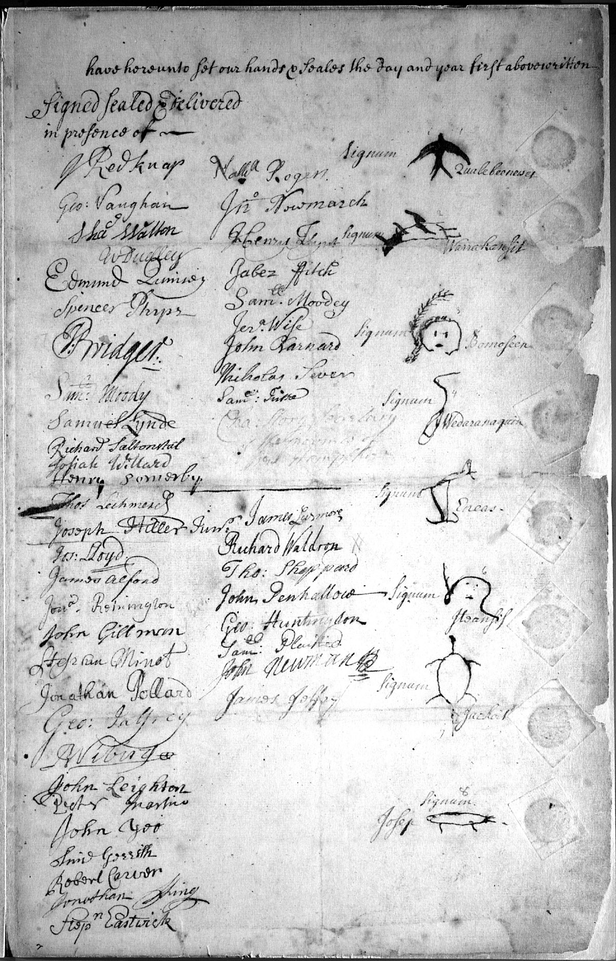 The signature of Abenaki sachem Bomoseen is one of many attached to the Portsmouth Peace Treaty of July 13, 1713. Some of these signatures are printed in spiraled cursive while others are elaborate totems, emblems used by Native American leaders to represent their tribe (1). Most totems on the treaty are recognizable figures like turtles, birds, or deer, but Bomoseen’s is not as easily discernible. Some, like Mary Calvert, have speculated that “Bomoseen’s totem is a charming drawing of a girl’s head bringing to mind that he had a dearly loved daughter” (2). This claim can be argued however, mirroring the complicated and debatable legacy Bomoseen left behind. Known best for leading the attack on Oyster River Plantation in 1694, he was a man revered by his Abenaki tribesmen and loathed by the British. But to understand Bomoseen and his place in the Oyster River Massacre, one must look deep into history prior to the raid and the related Portsmouth Peace Treaty to see the conflicts that had driven the Abenaki’s to fight in a white man’s war.