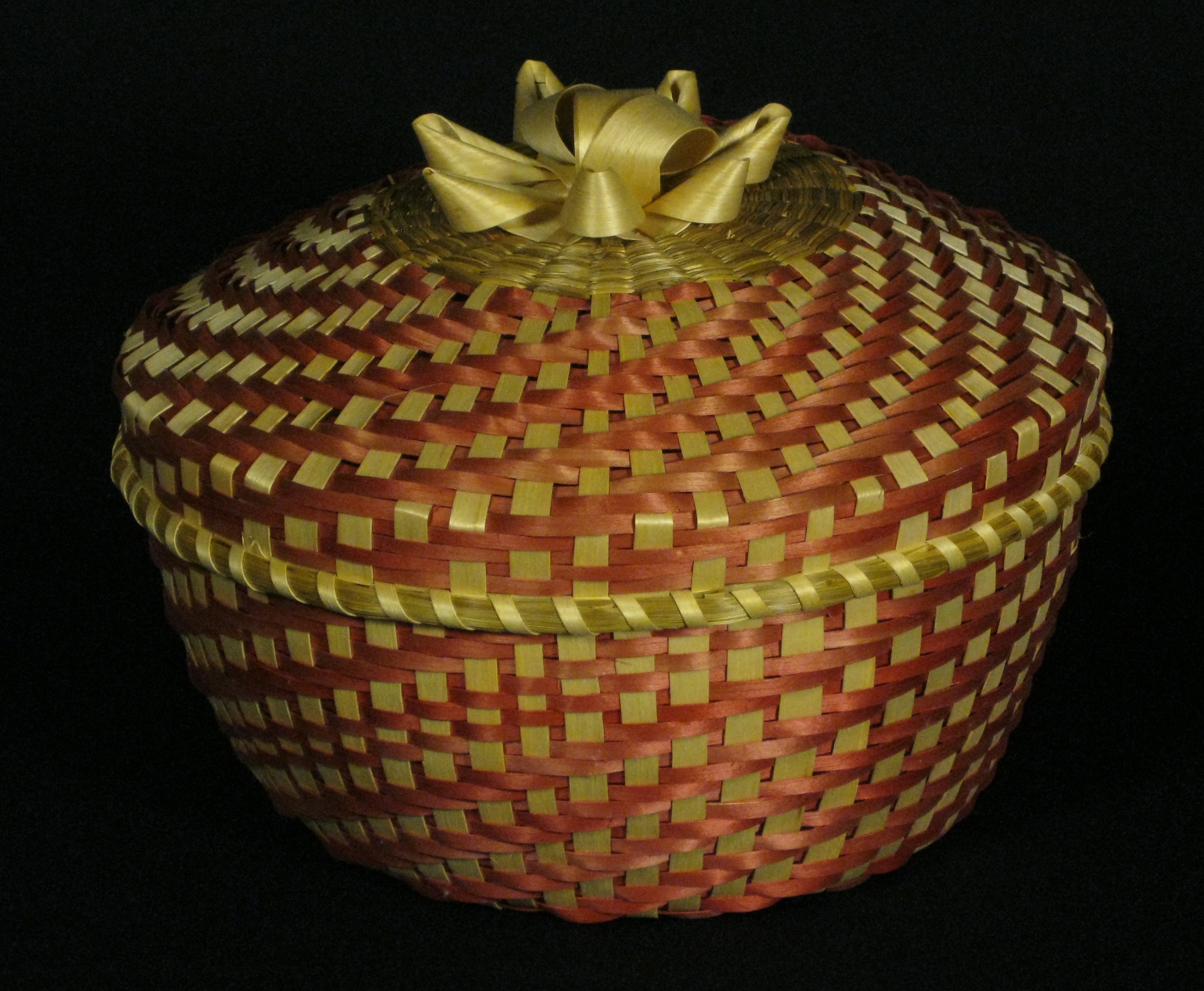 One of our most modern baskets, this red fancy basket was created by Mohawk Basketmaker Mary Adams in c. 1970. With its green and red ash splints making a continuous spiral pattern, the basket illustrates the intricate art of basketry. A circle of sweetgrass on the top of the basket with splints shaped into a flower like pattern demonstrates the artist's skill. More than just a decorative or utilitarian object, this basket tells a story of survival and triumph. Mary Adams' baskets incorporate modern aesthetics and a comment on the Mohawk world-view into the art and process of basketmaking. Every basket illustrates her life story and the debt that basketry as an art form owes to her. This piece is housed at the Mt. Kearsarge Indian Museum
